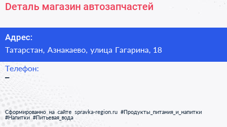 Dеталь, магазин автозапчастей по адресу Татарстан, Азнакаево, улица Гагарина, 18 в дальнейшем Организация, размещена в следующих категориях: