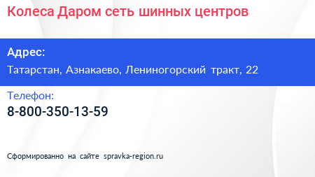 Колеса Даром, сеть шинных центров по адресу Татарстан, Азнакаево, Лениногорский тракт, 22 в дальнейшем Организация, размещена в следующих категориях: