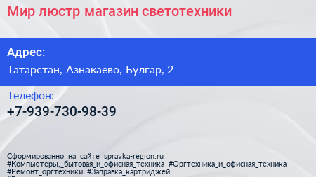 Мир люстр, магазин светотехники по адресу Татарстан, Азнакаево, Булгар, 2 в дальнейшем Организация, размещена в следующих категориях: