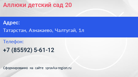 Аллюки, детский сад №20 по адресу Татарстан, Азнакаево, Чалтугай, 1л в дальнейшем Организация, размещена в следующих категориях: