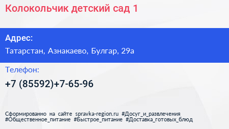 Колокольчик, детский сад №1 по адресу Татарстан, Азнакаево, Булгар, 29а в дальнейшем Организация, размещена в следующих категориях: