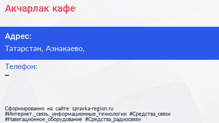 Акчарлак, кафе по адресу Татарстан, Азнакаево, в дальнейшем Организация, размещена в следующих категориях: