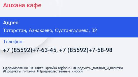 Ашхана, кафе по адресу Татарстан, Азнакаево, Султангалиева, 32 в дальнейшем Организация, размещена в следующих категориях: