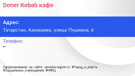 Doner Kebab, кафе по адресу Татарстан, Азнакаево, улица Пушкина, 6 в дальнейшем Организация, размещена в следующих категориях:
