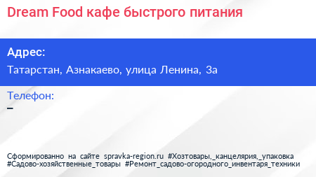 Dream Food, кафе быстрого питания по адресу Татарстан, Азнакаево, улица Ленина, 3а в дальнейшем Организация, размещена в следующих категориях: