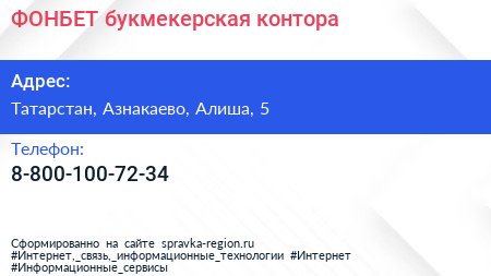 ФОНБЕТ, букмекерская контора по адресу Татарстан, Азнакаево, Алиша, 5 в дальнейшем Организация, размещена в следующих категориях: