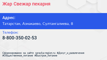 Жар Свежар, пекарня по адресу Татарстан, Азнакаево, Султангалиева, 8 в дальнейшем Организация, размещена в следующих категориях: