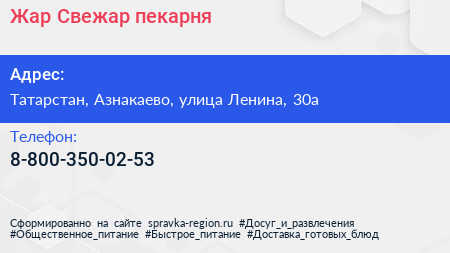 Жар Свежар, пекарня по адресу Татарстан, Азнакаево, улица Ленина, 30а в дальнейшем Организация, размещена в следующих категориях: