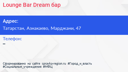Lounge Bar Dream, бар по адресу Татарстан, Азнакаево, Марджани, 47 в дальнейшем Организация, размещена в следующих категориях: