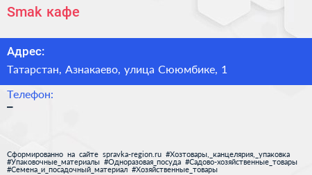 Smak, кафе по адресу Татарстан, Азнакаево, улица Сююмбике, 1 в дальнейшем Организация, размещена в следующих категориях: