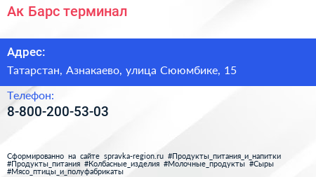 Ак Барс, терминал по адресу Татарстан, Азнакаево, улица Сююмбике, 15 в дальнейшем Организация, размещена в следующих категориях: