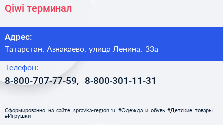 Qiwi, терминал по адресу Татарстан, Азнакаево, улица Ленина, 33а в дальнейшем Организация, размещена в следующих категориях: