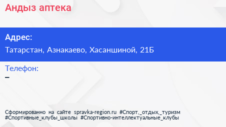 Андыз, аптека по адресу Татарстан, Азнакаево, Хасаншиной, 21Б в дальнейшем Организация, размещена в следующих категориях: