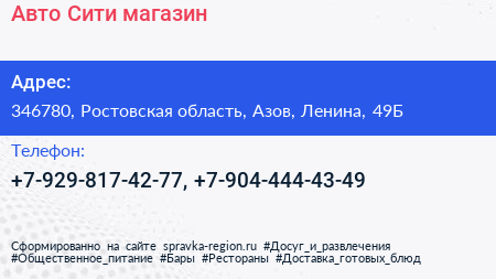 Авто-Сити, магазин по адресу 346780, Ростовская область, Азов, Ленина, 49Б в дальнейшем Организация, размещена в следующих категориях: