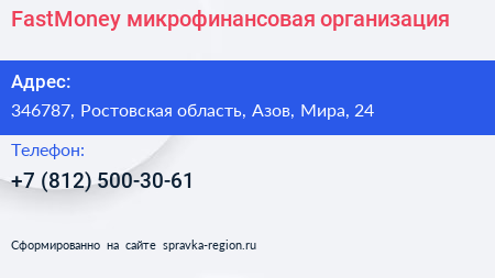 FastMoney, микрофинансовая организация по адресу 346787, Ростовская область, Азов, Мира, 24 в дальнейшем Организация, размещена в следующих категориях: