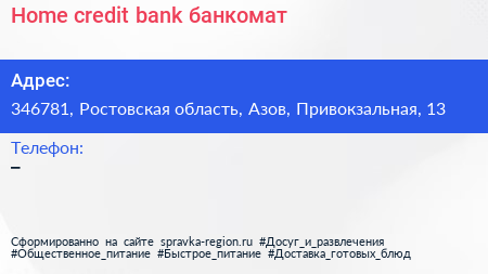Home credit bank, банкомат по адресу 346781, Ростовская область, Азов, Привокзальная, 13 в дальнейшем Организация, размещена в следующих категориях: