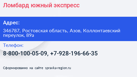 Ломбард южный экспресс по адресу 346787, Ростовская область, Азов, Коллонтаевский переулок, 89а в дальнейшем Организация, размещена в следующих категориях: