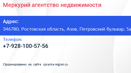 Меркурий, агентство недвижимости по адресу 346780, Ростовская область, Азов, Петровский бульвар, 5а в дальнейшем Организация, размещена в следующих категориях:
