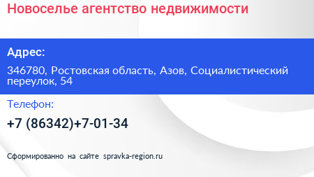 Новоселье, агентство недвижимости по адресу 346780, Ростовская область, Азов, Социалистический переулок, 54 в дальнейшем Организация, размещена в следующих категориях: