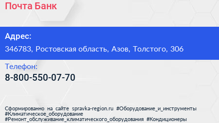 Почта Банк по адресу 346783, Ростовская область, Азов, Толстого, 306 в дальнейшем Организация, размещена в следующих категориях: