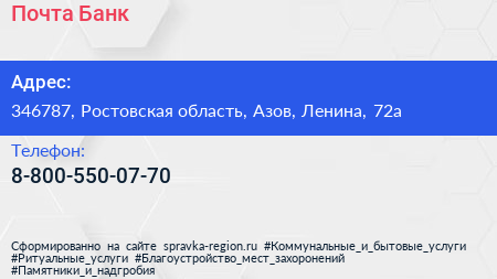 Почта Банк по адресу 346787, Ростовская область, Азов, Ленина, 72а в дальнейшем Организация, размещена в следующих категориях: