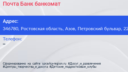 Почта Банк, банкомат по адресу 346780, Ростовская область, Азов, Петровский бульвар, 22 в дальнейшем Организация, размещена в следующих категориях: