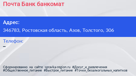 Почта Банк, банкомат по адресу 346783, Ростовская область, Азов, Толстого, 306 в дальнейшем Организация, размещена в следующих категориях: