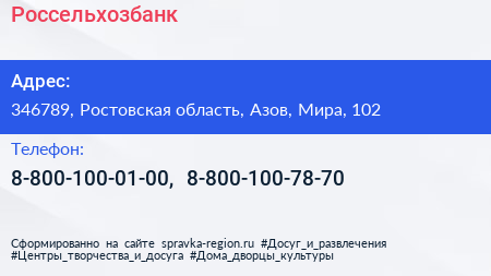 Россельхозбанк по адресу 346789, Ростовская область, Азов, Мира, 102 в дальнейшем Организация, размещена в следующих категориях: