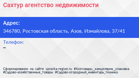 Сахтур, агентство недвижимости по адресу 346780, Ростовская область, Азов, Измайлова, 37/41 в дальнейшем Организация, размещена в следующих категориях: