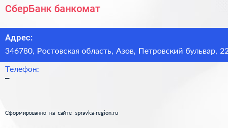 СберБанк, банкомат по адресу 346780, Ростовская область, Азов, Петровский бульвар, 22 в дальнейшем Организация, размещена в следующих категориях: