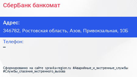 СберБанк, банкомат по адресу 346782, Ростовская область, Азов, Привокзальная, 10Б в дальнейшем Организация, размещена в следующих категориях: