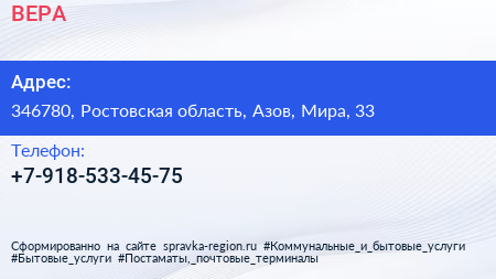 ВЕРА по адресу 346780, Ростовская область, Азов, Мира, 33 в дальнейшем Организация, размещена в следующих категориях: