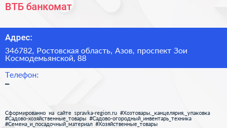 ВТБ, банкомат по адресу 346782, Ростовская область, Азов, проспект Зои Космодемьянской, 88 в дальнейшем Организация, размещена в следующих категориях: