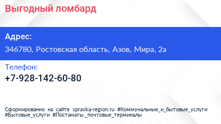 Выгодный, ломбард по адресу 346780, Ростовская область, Азов, Мира, 2а в дальнейшем Организация, размещена в следующих категориях:
