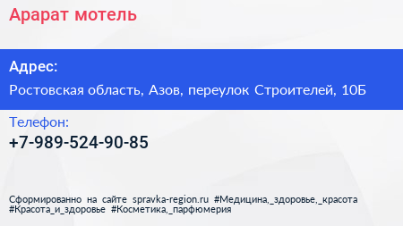 Арарат, мотель по адресу Ростовская область, Азов, переулок Строителей, 10Б в дальнейшем Организация, размещена в следующих категориях: