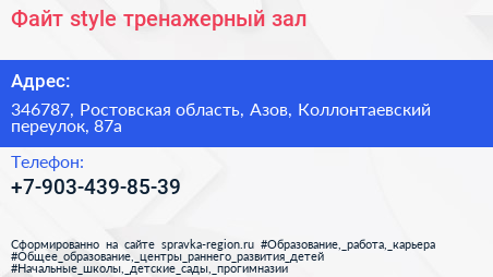 Файт style, тренажерный зал по адресу 346787, Ростовская область, Азов, Коллонтаевский переулок, 87а в дальнейшем Организация, размещена в следующих категориях: