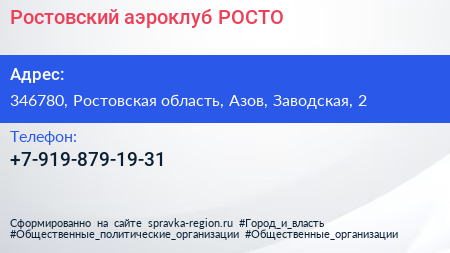 Ростовский аэроклуб РОСТО по адресу 346780, Ростовская область, Азов, Заводская, 2 в дальнейшем Организация, размещена в следующих категориях: