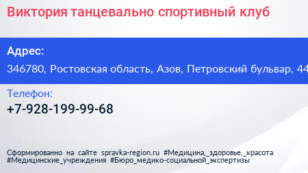 Виктория, танцевально-спортивный клуб по адресу 346780, Ростовская область, Азов, Петровский бульвар, 44 в дальнейшем Организация, размещена в следующих категориях: