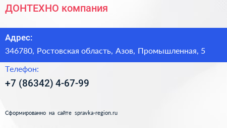 ДОНТЕХНО, компания по адресу 346780, Ростовская область, Азов, Промышленная, 5 в дальнейшем Организация, размещена в следующих категориях: