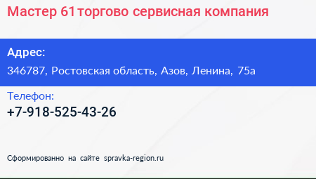Мастер 61, торгово-сервисная компания по адресу 346787, Ростовская область, Азов, Ленина, 75а в дальнейшем Организация, размещена в следующих категориях: