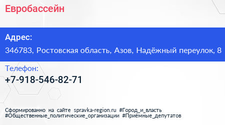 Евробассейн по адресу 346783, Ростовская область, Азов, Надёжный переулок, 8 в дальнейшем Организация, размещена в следующих категориях: