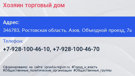 Хозяин, торговый дом по адресу 346783, Ростовская область, Азов, Объездной проезд, 7а в дальнейшем Организация, размещена в следующих категориях: