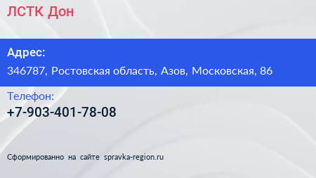 ЛСТК Дон по адресу 346787, Ростовская область, Азов, Московская, 86 в дальнейшем Организация, размещена в следующих категориях: