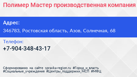 Полимер-Мастер, производственная компания по адресу 346783, Ростовская область, Азов, Солнечная, 68 в дальнейшем Организация, размещена в следующих категориях: