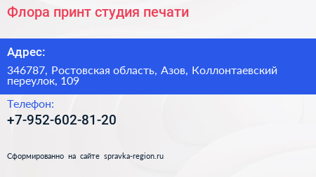Флора принт, студия печати по адресу 346787, Ростовская область, Азов, Коллонтаевский переулок, 109 в дальнейшем Организация, размещена в следующих категориях: