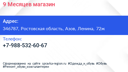 9 Месяцев, магазин по адресу 346787, Ростовская область, Азов, Ленина, 72ж в дальнейшем Организация, размещена в следующих категориях: