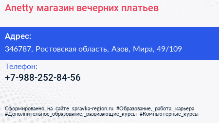 Anetty, магазин вечерних платьев по адресу 346787, Ростовская область, Азов, Мира, 49/109 в дальнейшем Организация, размещена в следующих категориях: