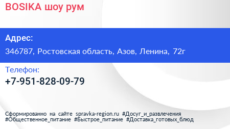 BOSIKA, шоу-рум по адресу 346787, Ростовская область, Азов, Ленина, 72г в дальнейшем Организация, размещена в следующих категориях:
