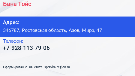 Бана Тойс по адресу 346787, Ростовская область, Азов, Мира, 47 в дальнейшем Организация, размещена в следующих категориях: