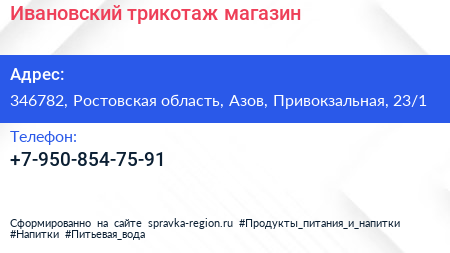 Ивановский трикотаж, магазин по адресу 346782, Ростовская область, Азов, Привокзальная, 23/1 в дальнейшем Организация, размещена в следующих категориях: